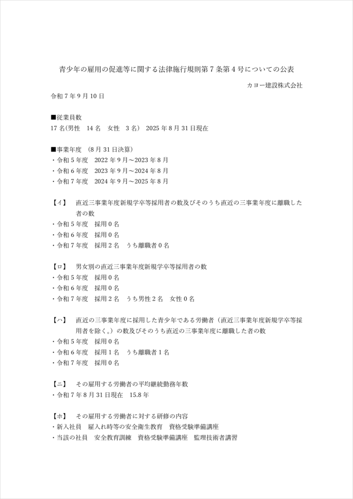 © KAYA House All Rights Reserved. 2025/09/16 お知らせ お知らせ一覧 青少年の雇用の促進等に関する法律施行規則第7条第4号についての公表 令和7年9月10日現在の、青少年の雇用の促進等に関する法律施行規則第7条第4号に記載の項目について公表しています。 記事一覧に戻る CONTACTお問い合わせ 新築・リフォームに関するご相談・ご質問など、お気軽にお問い合わせください。 お問合せ・資料請求 修理・メンテナンス相談 アクセス/ ACCESS かやハウス カヨー建設株式会社 〒701-1611 岡山県岡山市北区東山内526 GoogleMapで見る 会社概要